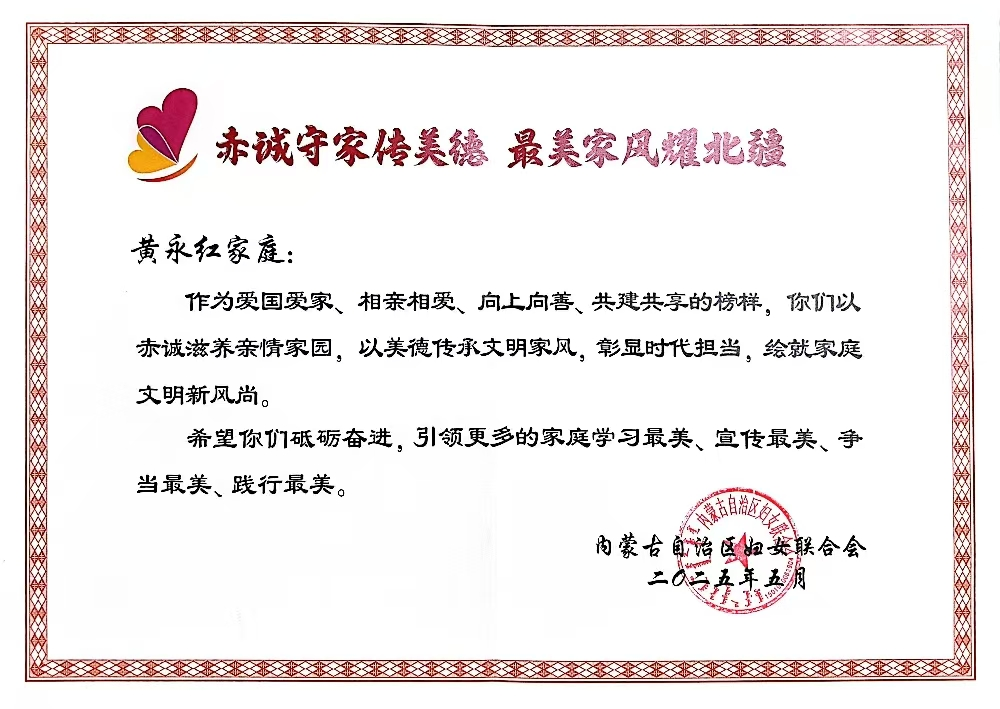 近日,內(nèi)蒙古自治區(qū)婦聯(lián)向全社會發(fā)布2024年度“最美家庭”,中國二冶職工黃永紅家庭榮獲2024年度自治區(qū)“最美家庭”榮譽稱號。