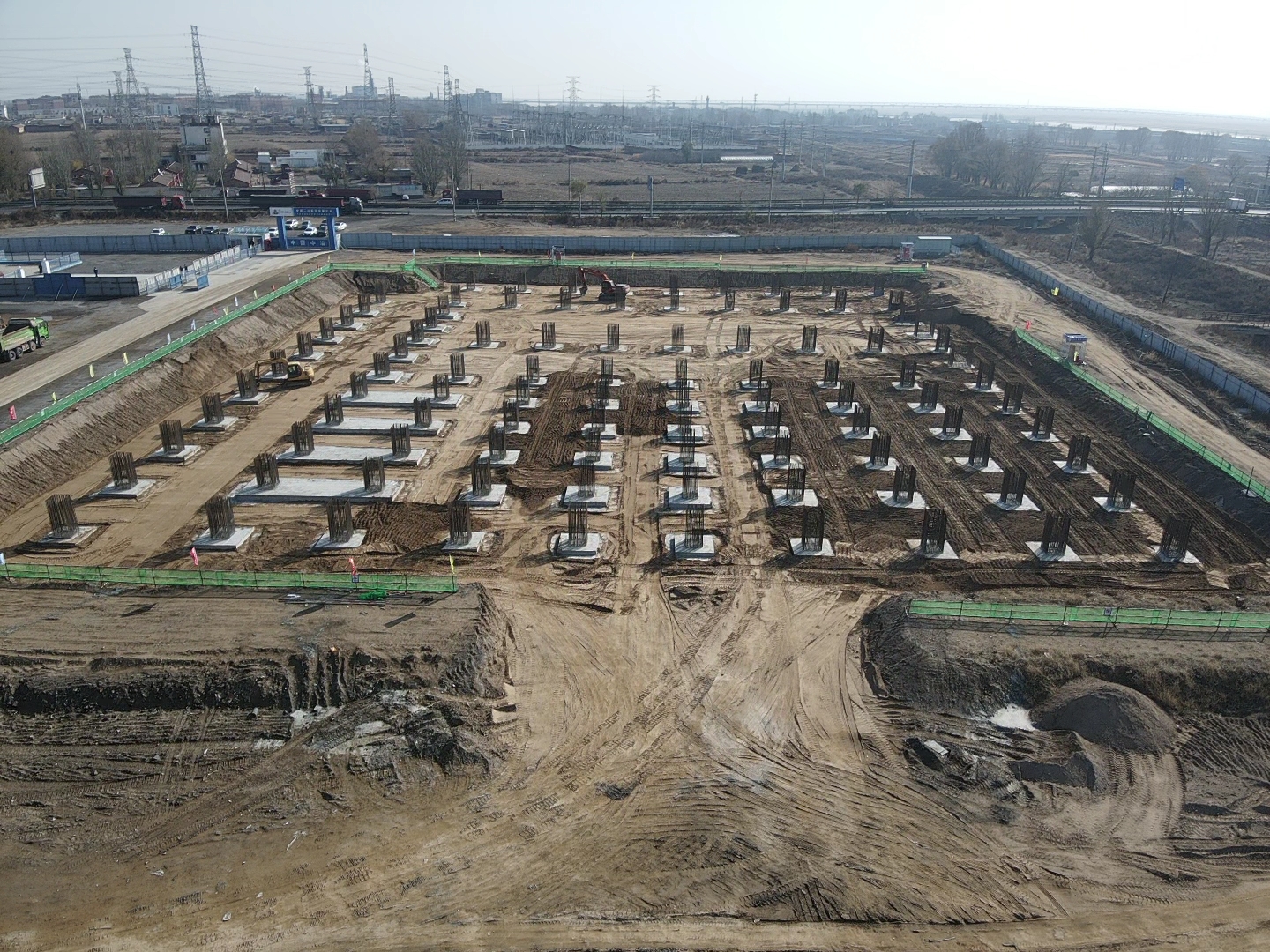 工程自破土動工后,項目部面臨包頭地區(qū)降雨頻次較往年多,雨量大,施工輻射面廣,土方開挖、三七灰土、基礎(chǔ)混凝土澆筑量大等重重考驗,為此,項目部緊緊抓住有效的90天黃金施工期,編制項目策劃,制定節(jié)點推進路線圖,增加勞動力投入并實行兩班倒,每日召開工作碰頭會,以及時解決制約現(xiàn)場施工的各類問題。同時,5臺挖掘機與5輛土方車、混凝土罐車通過“平行施工+流水作業(yè)”等施工方法加快施工進度,在短短的28天完成冷庫基礎(chǔ)首次混凝土澆筑任務,20天完成冷庫基礎(chǔ)全部施工任務,在初冬時節(jié)喜收碩果。