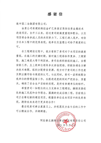 阿拉善左旗珠拉黃金開發(fā)有限責任公司在感謝信中指出,在工期緊、任務重的情況下,項目部在跟進進度的同時,嚴把安全質(zhì)量關(guān),確保了安全生產(chǎn)目標的實現(xiàn),是所有參建單位中的標桿。