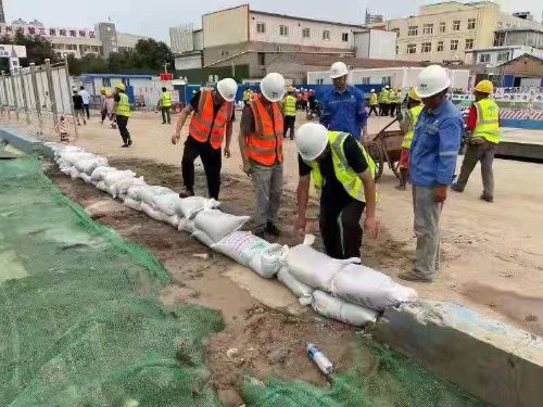 鶴壁開發(fā)區(qū)全域城市化建設(shè)項目部對施工現(xiàn)場生活區(qū)、辦公區(qū)和施工區(qū)進(jìn)行檢查,確保排水系統(tǒng)通暢。由于施工現(xiàn)場107國道積水嚴(yán)重,為有效防范積水倒灌在建項目基坑工程,項目部準(zhǔn)備了必備的排水機(jī)具、雨衣雨靴、編織袋和救生衣等防汛物資,組織全體管理人員在路基處設(shè)置排水溝,組織人力、物力和施工機(jī)械全力排除基坑中的積水。同時,持續(xù)24小時連續(xù)作業(yè),用沙袋在國道處搭筑起防洪墻,確保在建工程安全度汛。