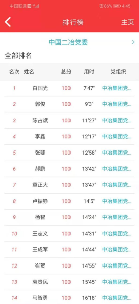 本次黨史知識(shí)競(jìng)賽,內(nèi)容涵蓋了習(xí)近平《論中國(guó)共產(chǎn)黨歷史》、《毛澤東、鄧小平、江澤民、胡錦濤關(guān)于中國(guó)共產(chǎn)黨歷史論述摘編》、《習(xí)近平新時(shí)代中國(guó)特色社會(huì)主義思想學(xué)習(xí)問(wèn)答》、《中國(guó)共產(chǎn)黨簡(jiǎn)史》等黨史內(nèi)容。競(jìng)賽依托五礦智慧黨建app平臺(tái)進(jìn)行,競(jìng)賽共300道試題,包括單項(xiàng)選擇、多項(xiàng)選擇。在競(jìng)賽時(shí)間內(nèi)可以隨時(shí)參與答題。后臺(tái)會(huì)根據(jù)答題的正確率由高到低進(jìn)行排列,正確率相同的,將已答題用時(shí)進(jìn)行排序。在答題競(jìng)賽中,每位黨員積極思考,認(rèn)真答題,踴躍參與,不少黨員紛紛表示,通過(guò)這個(gè)知識(shí)競(jìng)賽,使黨史、黨章、黨規(guī)都印在腦海里,理解也深刻。希望公司今后能多舉辦類(lèi)似活動(dòng),提升黨員政治理論知識(shí)與黨員思想覺(jué)悟能力,爭(zhēng)做優(yōu)秀共產(chǎn)黨員。本次黨史知識(shí)競(jìng)賽活動(dòng),公司共有1560名黨員干部踴躍參加,經(jīng)過(guò)激烈角逐,來(lái)自四川分公司的白國(guó)光以7分47秒的優(yōu)異成績(jī)?nèi)〉脻M分,獲得本次競(jìng)賽活動(dòng)的一等獎(jiǎng);來(lái)自市政分公司的郭俊等5名黨員獲得二等獎(jiǎng);來(lái)自華東分公司的王成軍等10名黨員獲得三等獎(jiǎng);來(lái)自甘肅分公司的高國(guó)義等30名黨員獲得優(yōu)秀獎(jiǎng)。