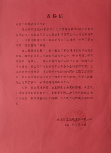8月9日,中國二冶收到業(yè)主單位山東財匯控股集團有限公司的表揚信,來信對中國二冶集團科學組織、精心部署表示感謝,對棗莊人民醫(yī)院建設(EPC)項目當前的各項工作進展情況給予了高度贊揚。