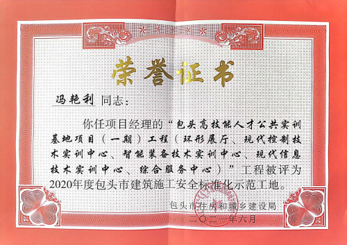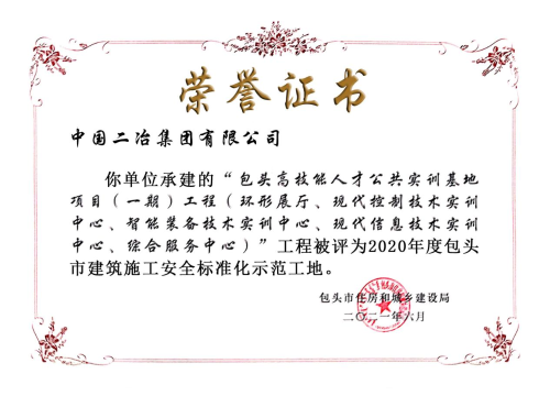 近日,從包頭市安監(jiān)站獲悉,中國二冶城建分公司實訓基地項目被內(nèi)蒙古自治區(qū)包頭市住房和城鄉(xiāng)建設局評為2020年度包頭市建筑施工安全標準化示范工地。