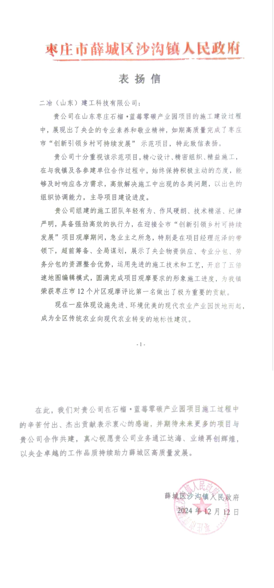 棗莊市薛城區(qū)沙溝鎮(zhèn)人民政府來信對二冶(山東)建工在棗莊石榴·藍莓零碳產(chǎn)業(yè)園項目施工中展現(xiàn)出的央企專業(yè)素養(yǎng)和敬業(yè)精神表示肯定,對項目在棗莊市12個片區(qū)觀摩評比中助力沙溝鎮(zhèn)榮獲第一名所作出的重要貢獻表示由衷感謝,對今后的合作共建寄予期望。棗莊石榴·藍莓零碳產(chǎn)業(yè)園項目作為推行國家鄉(xiāng)村振興戰(zhàn)略、國家數(shù)字化農(nóng)業(yè)戰(zhàn)略、綠色農(nóng)業(yè)、“雙碳” 戰(zhàn)略的示范項目,受到當(dāng)?shù)卣母叨戎匾暋m椖繄F隊秉承中國二冶雷厲風(fēng)行、使命必達的工作作風(fēng),以強勁硬朗的執(zhí)行能力高質(zhì)高效推進項目建設(shè)進度,為地方鄉(xiāng)村振興奉獻了央企智慧和力量。