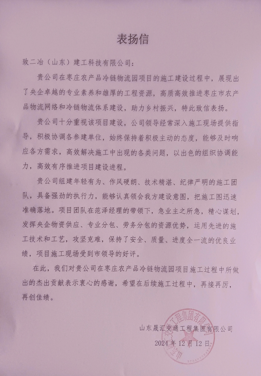 山東晟匯交通工程集團有限公司來信表揚二冶(山東)建工在棗莊農(nóng)產(chǎn)品冷鏈物流園項目建設(shè)中展現(xiàn)出的央企卓越專業(yè)素養(yǎng)和雄厚工程資源。棗莊農(nóng)產(chǎn)品冷鏈物流園項目是山東省物流發(fā)展戰(zhàn)略重點規(guī)劃建設(shè)項目之一,是棗莊市農(nóng)產(chǎn)品物流網(wǎng)絡(luò)和冷鏈物流體系建設(shè)重點項目,工期緊、任務(wù)重,建設(shè)中,山東公司領(lǐng)導(dǎo)深入施工現(xiàn)場,協(xié)調(diào)參建各方,形成共識,協(xié)同一致高效推進項目進度。項目團隊嚴(yán)格執(zhí)行公司指令,攻堅克難,用強勁的執(zhí)行力確保項目高質(zhì)量落地。歷時100多天的項目攻堅戰(zhàn),項目團隊成員的專業(yè)技能在實踐歷練中升華,團隊協(xié)作在施工現(xiàn)場磨合中趨于默契,一支敢打硬仗的青年突擊隊在公司的精心培育下茁壯成長。項目團隊在施工現(xiàn)場展現(xiàn)的央企風(fēng)貌得到項目參建各方的高度認(rèn)可和尊重。