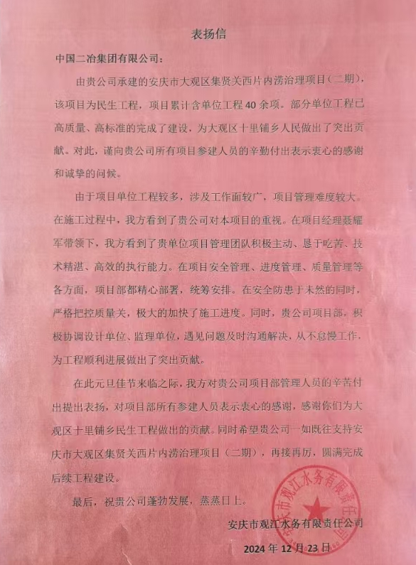 近日,安慶市大觀區(qū)十里鋪鄉(xiāng)人民政府和安慶市觀江水務(wù)有限責(zé)任公司給中國二冶發(fā)來表揚(yáng)信,對(duì)安慶市大觀區(qū)集賢關(guān)西片內(nèi)澇治理項(xiàng)目(二期)高質(zhì)量、高標(biāo)準(zhǔn)完成施工任務(wù)給予高度贊揚(yáng)。
