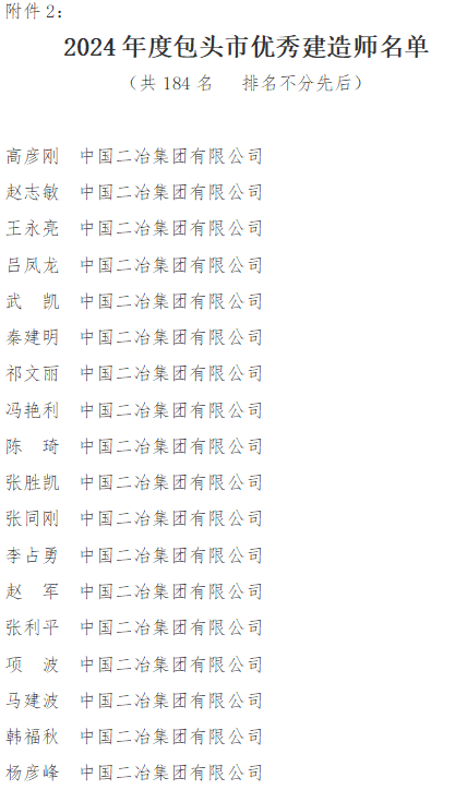 近日,包頭市住房和城鄉(xiāng)建設(shè)局通報表彰了全市2024年度建筑業(yè)優(yōu)秀施工企業(yè)、優(yōu)秀監(jiān)理企業(yè)及2024年度優(yōu)秀建造師、優(yōu)秀總監(jiān)理工程師。中國二冶獲評“2024年度包頭市建筑業(yè)優(yōu)秀施工企業(yè)”,同時30名職工獲評2024年度包頭市優(yōu)秀建造師,為公司榮譽榜再添佳績。