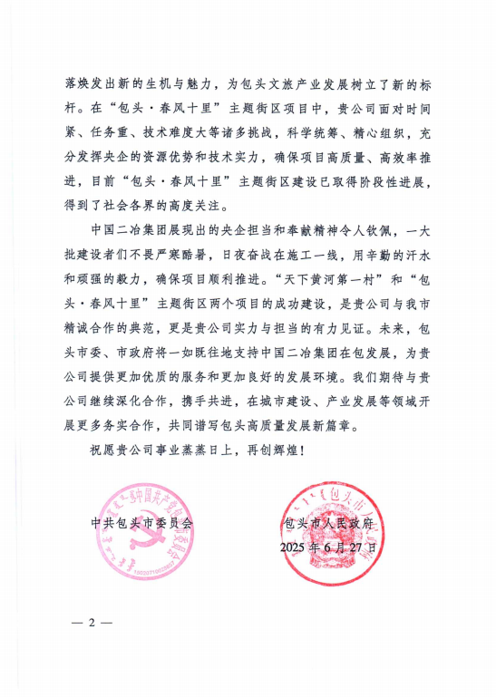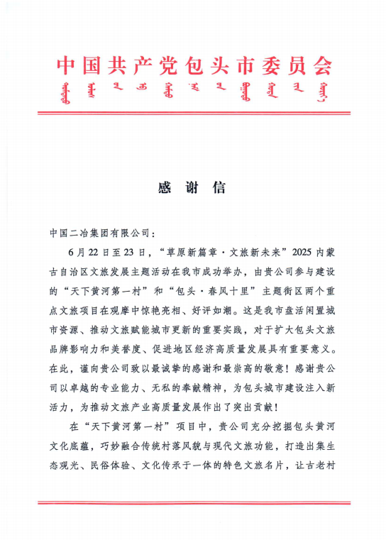 6月30日,中國二冶收到包頭市委、市政府發(fā)來的表揚(yáng)信,對中國二冶在“天下黃河第一村”和“包頭?春風(fēng)十里”兩大重點(diǎn)文旅項目建設(shè)中作出的卓越貢獻(xiàn),給予高度贊譽(yù)。?
