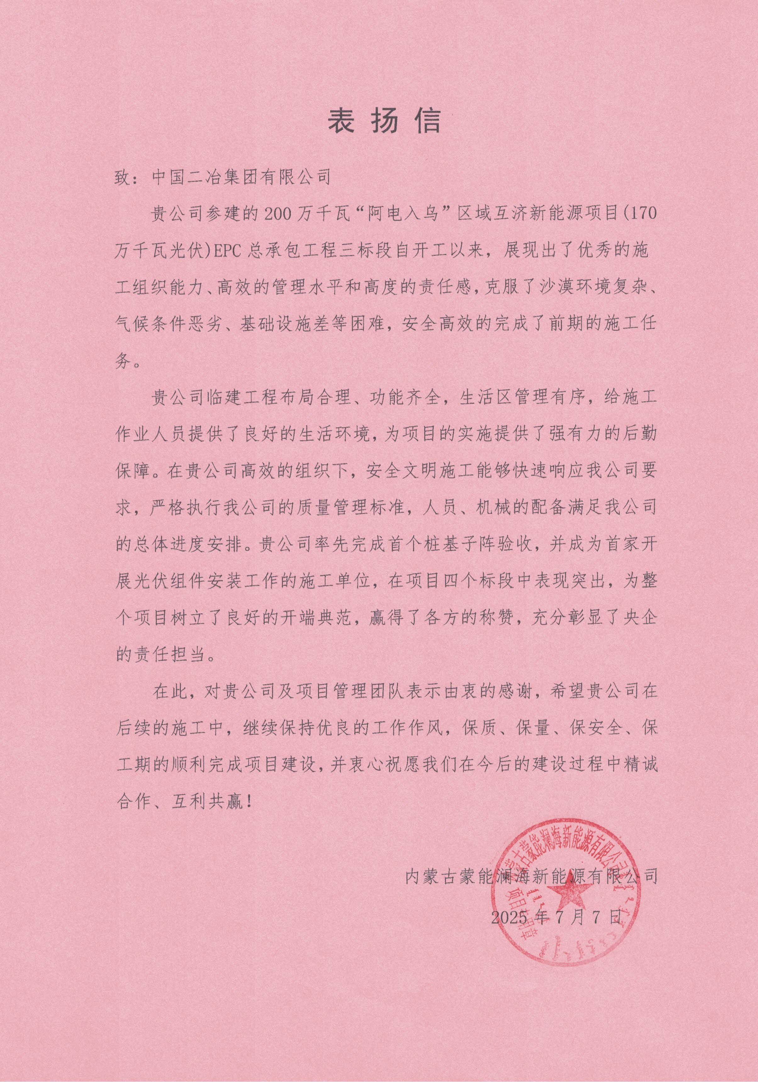 近日,中國二冶收到內(nèi)蒙古蒙能瀾海新能源有限公司表揚(yáng)信,對中國二冶200 萬千瓦“阿電入烏”區(qū)域互濟(jì)新能源項(xiàng)目(170萬千瓦光伏)EPC總承包工程三標(biāo)段施工中的出色表現(xiàn)予以高度肯定。
