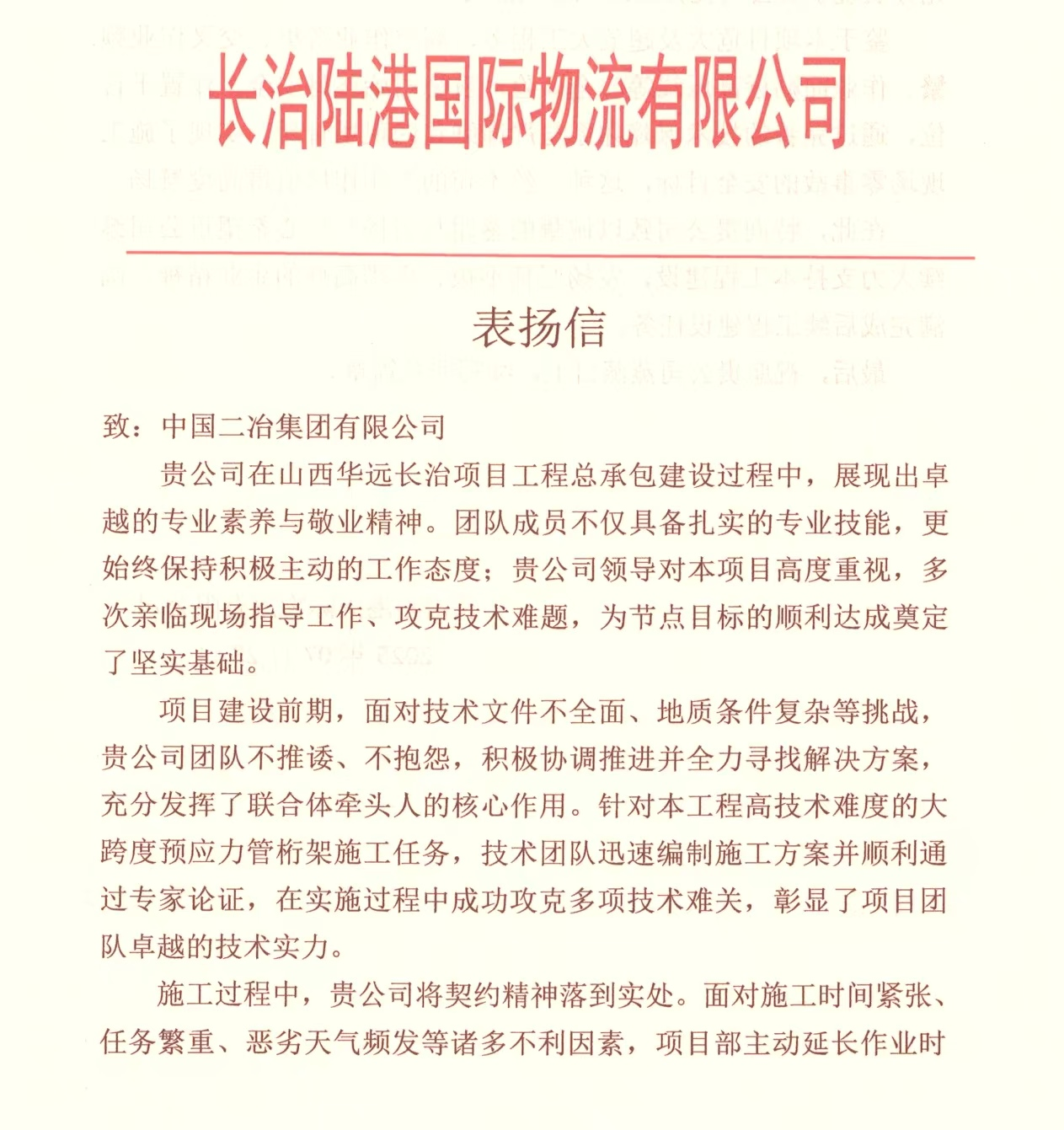 7月23日,中國二冶收到來自長治陸港國際物流有限公司表揚(yáng)信。對中國二冶鋼構(gòu)公司山西長治項目管理團(tuán)隊攻堅克難,順利實現(xiàn)項目既定目標(biāo)提出表揚(yáng)。