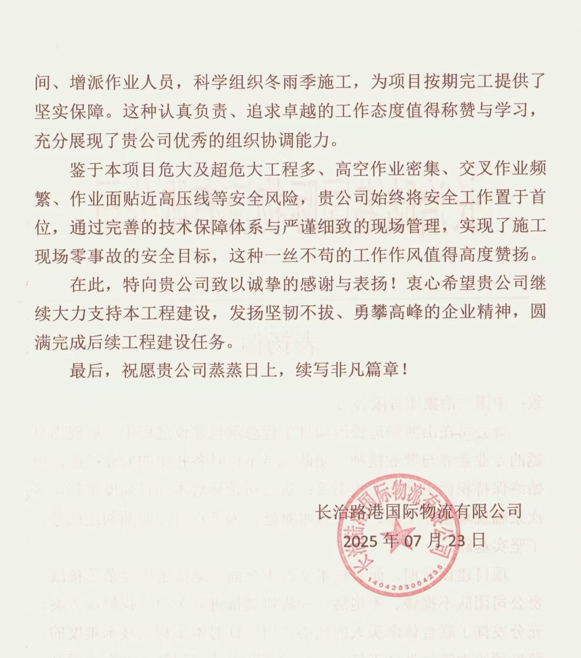 信中指出,工程自進(jìn)場施工以來,貴公司領(lǐng)導(dǎo)對本項目高度重視,多次親臨現(xiàn)場指導(dǎo)工作、攻克技術(shù)難題,為節(jié)點(diǎn)目標(biāo)的順利達(dá)成奠定了堅實基礎(chǔ)。在實施過程中,項目管理團(tuán)隊攻克多項技術(shù)難關(guān),保質(zhì)保量按照計劃實現(xiàn)了預(yù)期目標(biāo),彰顯了項目團(tuán)隊卓越的技術(shù)實力。特別是施工關(guān)鍵時期,由于本項目存在危大及超危大工程多,高空作業(yè)密集,交叉作業(yè)頻繁等安全風(fēng)險,為此,項目管理團(tuán)隊始終將安全工作置于首位,通過完善的技術(shù)保障體系與嚴(yán)謹(jǐn)細(xì)致的現(xiàn)場管理,實現(xiàn)了施工現(xiàn)場零事故的安全目標(biāo)。