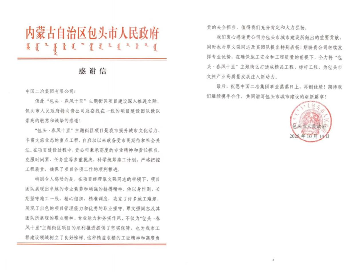 這封感謝信不僅是對(duì)中國(guó)二冶項(xiàng)目團(tuán)隊(duì)攻堅(jiān)克難、高效履約的高度認(rèn)可,更是對(duì)中國(guó)二冶秉持工匠精神、踐行央企責(zé)任擔(dān)當(dāng)?shù)挠辛τ∽C。中國(guó)二冶將以此為激勵(lì),持續(xù)發(fā)揮專業(yè)優(yōu)勢(shì),在嚴(yán)守施工安全與工程質(zhì)量的前提下,全力將“包頭?春風(fēng)十里”主題街區(qū)打造成精品工程、標(biāo)桿工程,為包頭市文旅產(chǎn)業(yè)高質(zhì)量發(fā)展注入更多二冶力量。