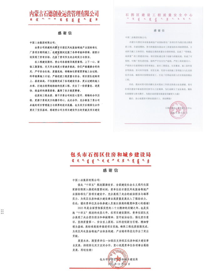 感謝信中表示,中國(guó)二冶在內(nèi)蒙古石拐區(qū)風(fēng)電裝備制造產(chǎn)業(yè)園標(biāo)準(zhǔn)化廠房項(xiàng)目建設(shè)過(guò)程中,充分展現(xiàn)了央企的政治擔(dān)當(dāng)與雄厚實(shí)力,為石拐區(qū)住房和城鄉(xiāng)建設(shè)事業(yè)高質(zhì)量發(fā)展注入了強(qiáng)勁動(dòng)力。在項(xiàng)目建設(shè)中,項(xiàng)目管理團(tuán)隊(duì)堅(jiān)守政治站位,堅(jiān)持質(zhì)量第一安全至上的原則,構(gòu)筑了完善的質(zhì)量安全管控體系,形成了可復(fù)制、可推廣的先進(jìn)經(jīng)驗(yàn)。憑借專業(yè)的施工管理能力與扎實(shí)的技術(shù)功底,解決了工期緊迫、任務(wù)繁重、施工條件復(fù)雜等挑戰(zhàn),確保了項(xiàng)目按期保質(zhì)竣工,交出了一份質(zhì)量?jī)?yōu)、進(jìn)度快、效益好的滿意答卷,贏得了各方高度贊譽(yù)。