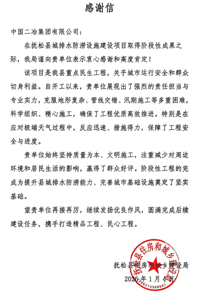 感謝信是對(duì)中國(guó)二冶建設(shè)成果的高度認(rèn)可,也是對(duì)團(tuán)隊(duì)付出的充分信賴。未來,中國(guó)二冶將以此為激勵(lì),持續(xù)深耕撫松縣建設(shè)領(lǐng)域,以更多優(yōu)質(zhì)精品工程賦能地方發(fā)展,為推動(dòng)地區(qū)經(jīng)濟(jì)社會(huì)高質(zhì)量發(fā)展貢獻(xiàn)更大央企力量。