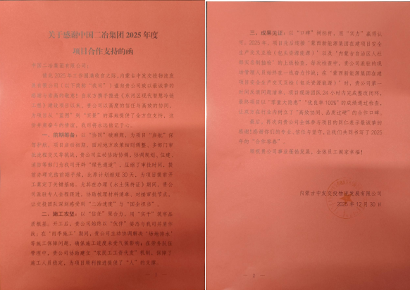 1月4日,中國二冶收到內(nèi)蒙古中發(fā)交投物流發(fā)展有限公司感謝信,對中國二冶以高度的信任與高效的協(xié)同,為項目從“藍圖”到“實景”的落地提供了全鏈條服務(wù)、全方位支持給予高度肯定和誠摯感謝。