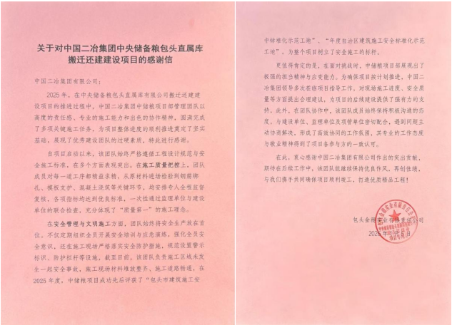 感謝信指出,在2025年項(xiàng)目推進(jìn)過程中,中國二冶中儲(chǔ)糧項(xiàng)目部管理團(tuán)隊(duì)以高度的責(zé)任感、專業(yè)的施工能力和出色的協(xié)作精神,圓滿完成了多項(xiàng)關(guān)鍵施工任務(wù),為項(xiàng)目整體順利推進(jìn)奠定了堅(jiān)實(shí)基礎(chǔ)。團(tuán)隊(duì)嚴(yán)格遵循設(shè)計(jì)規(guī)范與安全標(biāo)準(zhǔn),在施工質(zhì)量上精益求精,從原材料進(jìn)場到各關(guān)鍵工序均嚴(yán)格把控,一次性通過各項(xiàng)檢查,將“質(zhì)量第一”理念貫穿施工全流程。