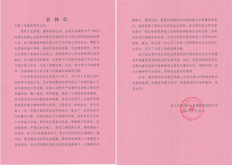 信中指出,2025年是雙方合作的第六個(gè)年頭,自貴公司中標(biāo)新項(xiàng)目進(jìn)場(chǎng)以來,能夠根據(jù)實(shí)際情況做出合理的施工計(jì)劃和高效的工作部署,嚴(yán)格遵守各項(xiàng)施工規(guī)范和質(zhì)量標(biāo)準(zhǔn),精心策劃、科學(xué)管理,確保了工程進(jìn)度快速推進(jìn)。施工過程中,面對(duì)現(xiàn)場(chǎng)及外部環(huán)境的各種難題,貴單位的項(xiàng)目人員始終保持著高度的敬業(yè)精神和職業(yè)素養(yǎng),不畏艱辛、加班加點(diǎn),堅(jiān)守施工一線,憑借豐富的經(jīng)驗(yàn)和科學(xué)的組織,制定了一系列切實(shí)可行的解決方案。尤其是進(jìn)入冬季施工以來,項(xiàng)目部突破低溫、寒潮等不利條件,堅(jiān)持高標(biāo)準(zhǔn)、嚴(yán)要求組織施工,積極采用暖棚法、蓄熱法、摻早強(qiáng)防凍劑等組合措施,精準(zhǔn)控制混凝土入模溫度與養(yǎng)護(hù)溫度,有效保障關(guān)鍵構(gòu)件質(zhì)量穩(wěn)定、強(qiáng)度達(dá)標(biāo),圓滿完成各項(xiàng)施工節(jié)點(diǎn),充分展現(xiàn)了項(xiàng)目團(tuán)隊(duì)特別能吃苦、特別能戰(zhàn)斗的作風(fēng)以及過硬的技術(shù)組織能力與質(zhì)量底線意識(shí),在稀土領(lǐng)域樹立了良好的口碑和企業(yè)形象。