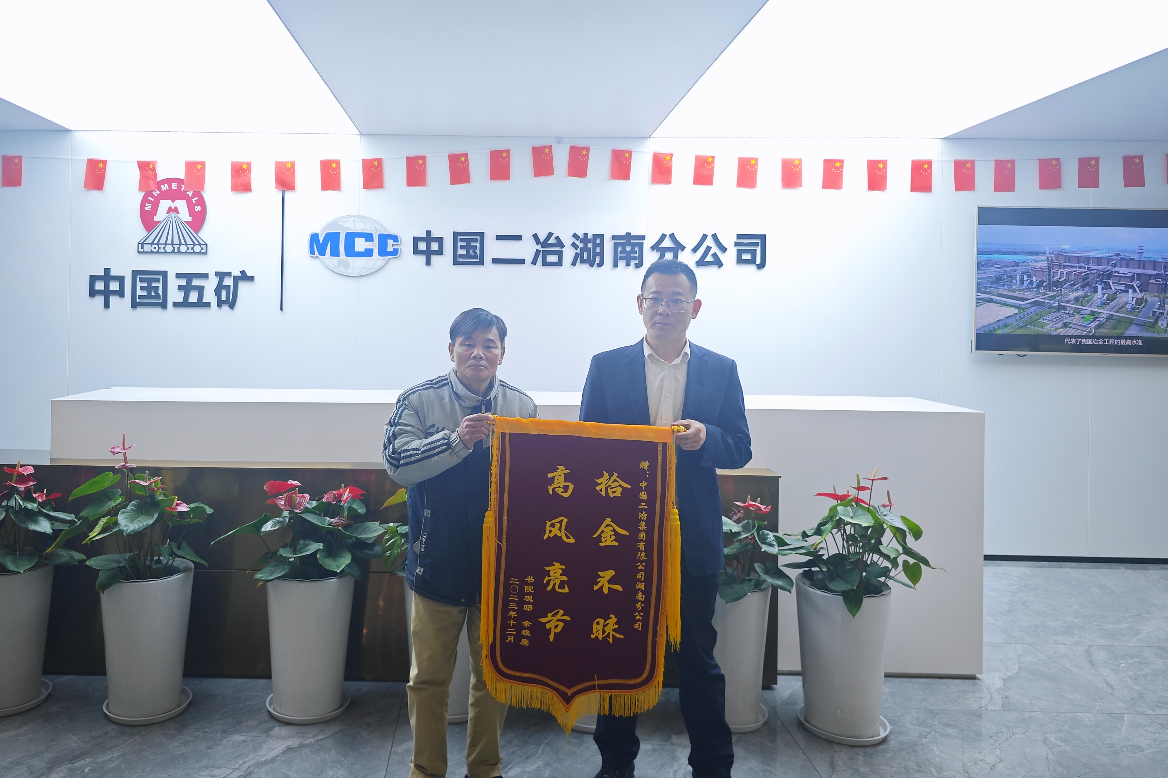 12月29日,長(zhǎng)沙市書院觀邸小區(qū)居民佘先生將一面印有“拾金不昧 高風(fēng)亮節(jié)”的錦旗送到了湖南分公司,對(duì)中國(guó)二冶湖南分公司職工郭振華拾金不昧的善舉表示感謝。