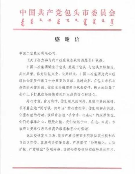 近日,中國二冶相繼收到了包頭市委、市政府、包頭昆河鎮(zhèn)政府、包頭前進道辦事處、昆北街道辦事處和少先路街道辦事處的感謝信,感謝中國二冶在此次疫情防控戰(zhàn)役中高站位、講政治、講紀律,認真貫徹落實市委市政府和上級單位有關(guān)疫情防控工作要求,不折不扣地執(zhí)行防控措施,在確保廣大員工生命安全的同時,肩負起央企的責任和使命,用有力的支持和快速的行動,全力助力疫情防控,為包頭市疫情防控工作貢獻央企力量。